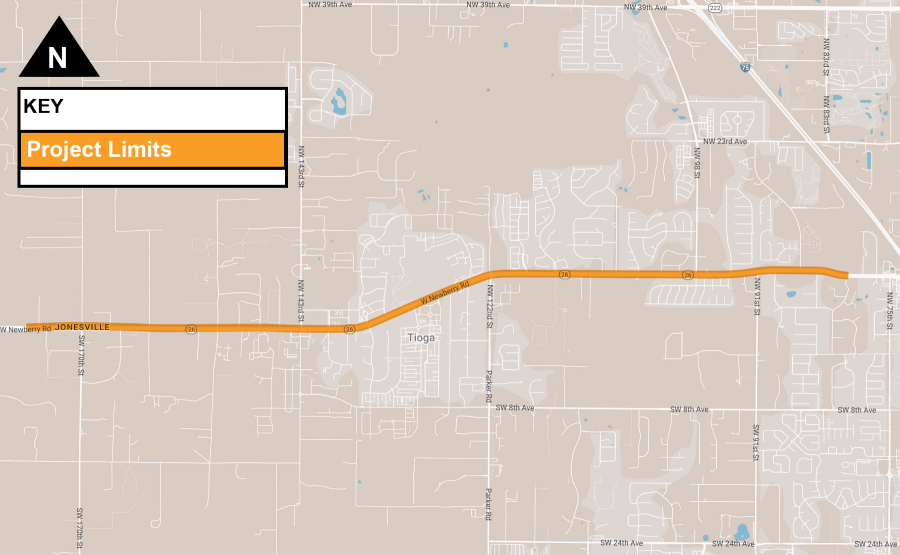 The Florida Department of Transportation is scheduled to resurface State Road 26 (Newberry Road) from west of County Road 241 South to west of I-75 in Alachua County. Improvements include milling and resurfacing, base work, drainage improvements, curb and gutters, traffic signals, highway signing, sidewalks, and other incidental construction.
