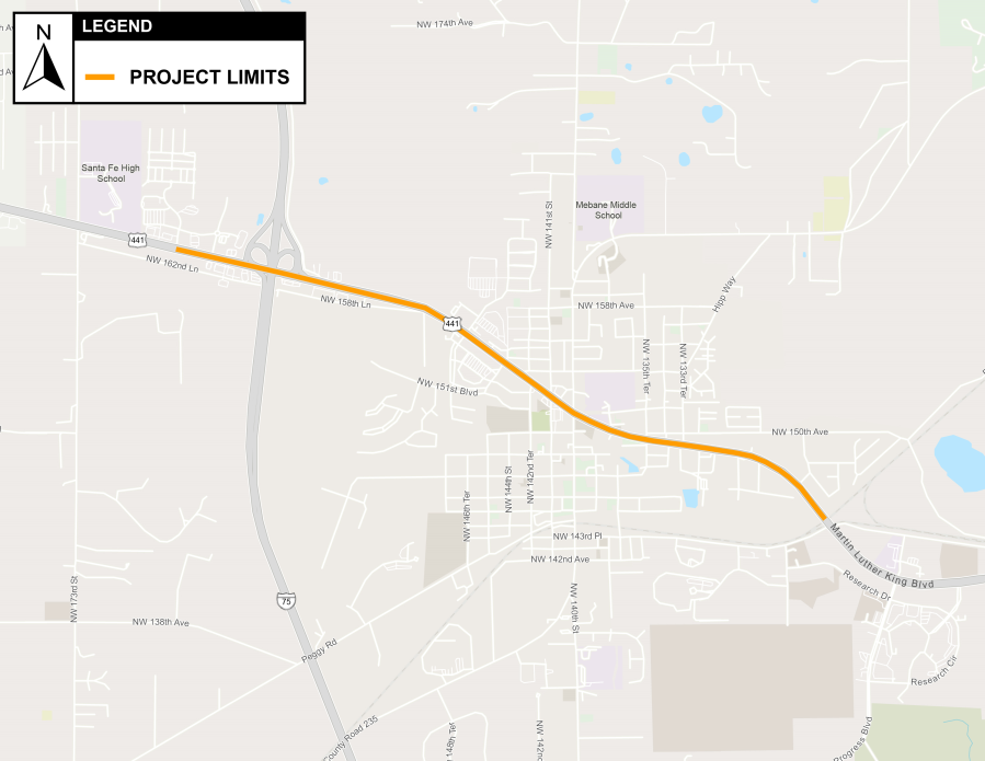 The project consists of milling and resurfacing, base work, shoulder treatment, drainage improvements, curb and gutters, sidewalk, highway signing, and other incidental construction on U.S. 441 (State Road 20) Martin Luther King Memorial Highway from Northwest 167th Boulevard to County Road 2054 in Alachua County.